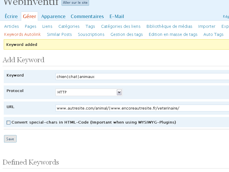 Keywords Autolink vous permet donc de définir depuis l'interface d'administration, un mot clé (ou un groupe de mots clés) ainsi que l'URL (ou le groupe d'URL) vers laquelle il doit pointer ! Et tout celà sans devoir éditer vos billets, car la fonction détecte automatiquement les mots clés dans vos articles et les transforme en liens !